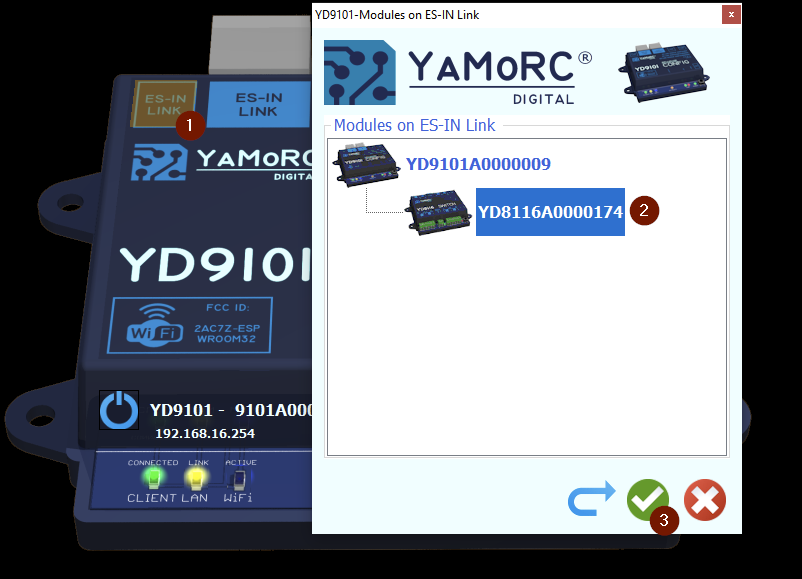 Über die YD9101-Anwendung, welche als Dreh- und Angelpunkt zur Konfiguration diverser YaMoRC-Module via ES-LINK verwendet werden kann, muss nun über den "ES-IN-LINK" (1) das darüber angeschlossene YD8116-Modul (2) ausgewählt und aktiviert (3) werden.